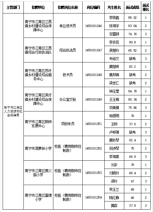 南寧市江南區(qū)人力資源和社會(huì)保障局2025年公開考試招聘事業(yè)單位工作人員面試成績(jī)表