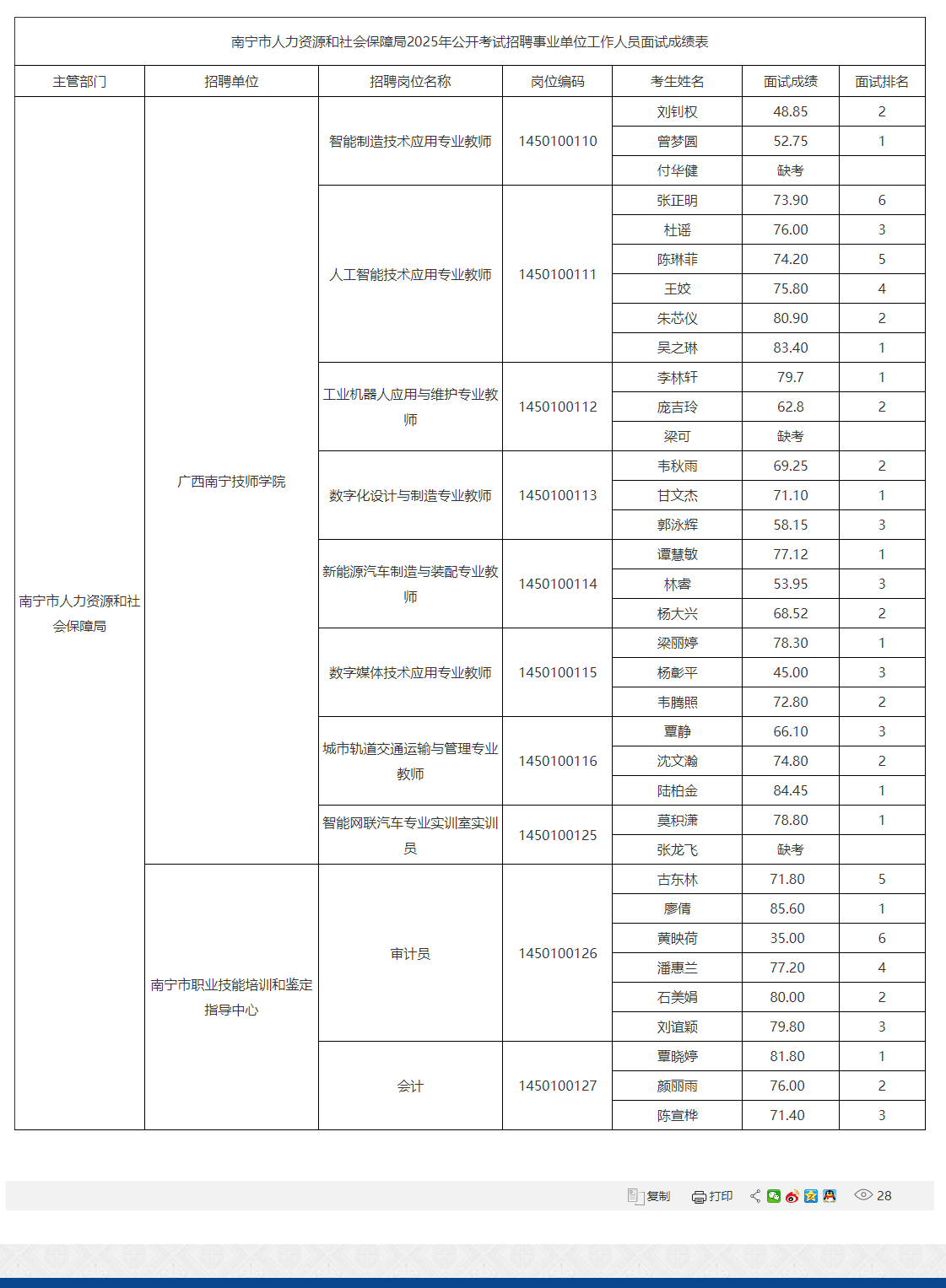 原文標(biāo)題:南寧市人力資源和社會保障局2025年公開考試招聘事業(yè)單位工作人員面試成績表