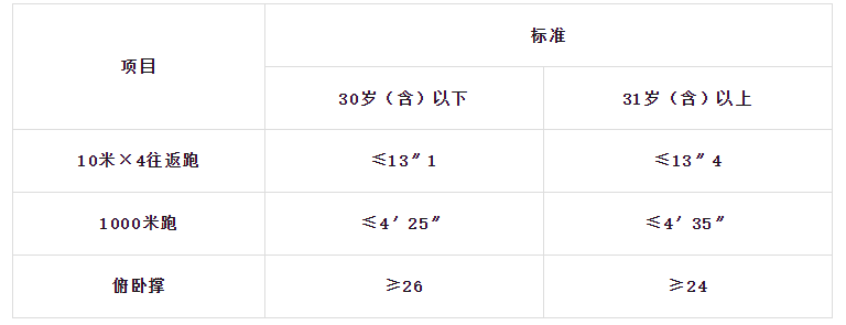 體能測試項目三項達標(biāo)的,視為合格。10米×4往返跑項目的測評次數(shù)不超過2次,1000米跑、俯臥撐等項目的測評次數(shù)為1次。