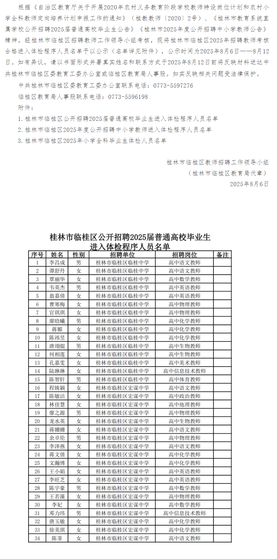 文章來(lái)源:桂林市臨桂區(qū)2025年招聘教師考核合格進(jìn)入體檢程序人員名單公示