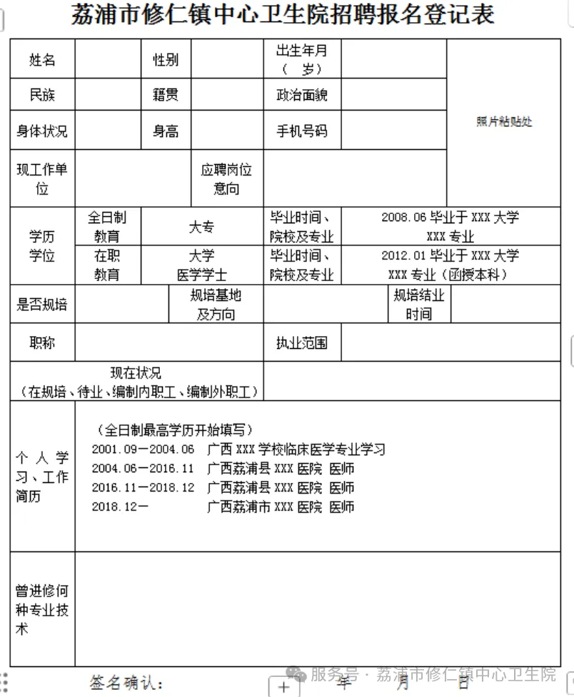 5.其他材料(荔浦市修仁鎮(zhèn)中心衛(wèi)生院招聘報名登記表)。