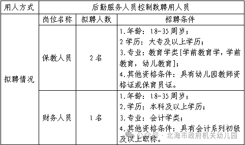 為滿足幼兒園后勤服務(wù)用人的需要,擬向社會(huì)公開(kāi)招聘后勤服務(wù)人員控制數(shù)工作人員3名。