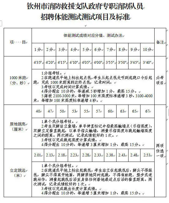 2.體能測試:(1)必考項目:1000米跑;(2)選考項目:①立定跳遠(yuǎn)、原地跳高二選一;②單杠引體向上、俯臥撐二選一;③10米×4往返跑、100米跑二選一;(3)注意事項:體能測試有兩項及兩項以上不得分的視為不合格(標(biāo)準(zhǔn)參照附件)。未按時參加或因身體原因無法測試者,視為自動放棄。